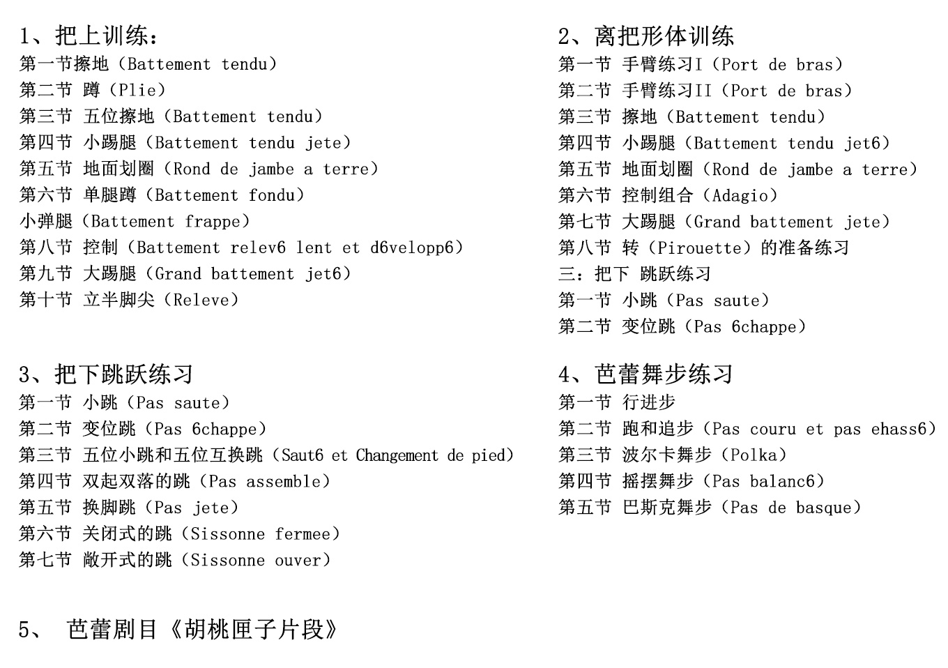 课程风格:较为专业严谨的芭蕾课程, 同芭蕾专业的学生进行一样的舞蹈课程。让学生拥有专业芭蕾舞明星演员的修长身体与完美线条,让学生感受到专业院校的上课模式,对保持体重又较强的观念, 对芭蕾艺术有着浓厚的兴趣与信仰。教学以俄派芭蕾为教习基础后涉及到足尖课程,以及进行变奏课,从而更好得学习理解芭蕾舞。在上课过程中全程使用术语。
